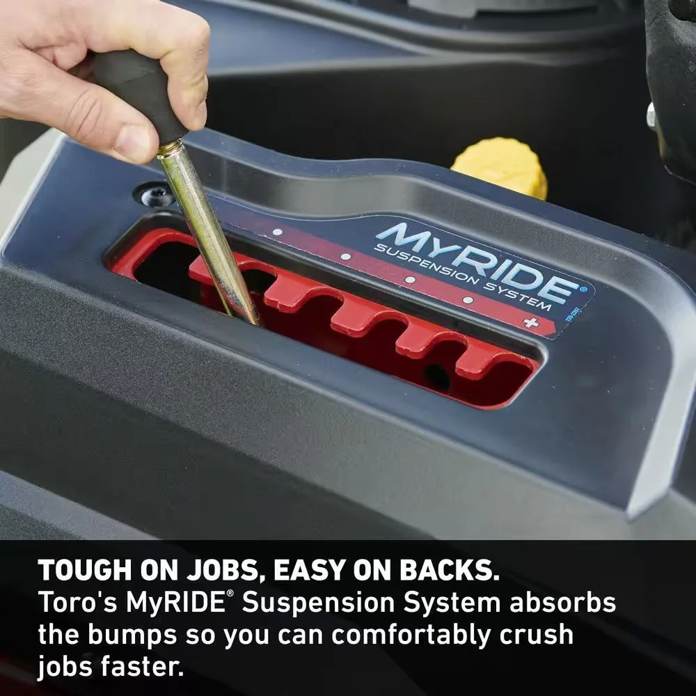 - Toro’s got your back, literally, our MyRIDE suspension system features a suspended rear and front shock adjustable operator platform that takes the bumps so your body doesn’t, instead of just relying on a foam seat and tires for cushion, MyRide is suspended above the iron forged deck for a ride so comfortable, you don’t need to go slow when it gets rough, and because we isolate the suspension from the frame, the deck stays level to the ground, giving you a higher quality cut, with MyRIDE, the best seat in the house is actually in the yard